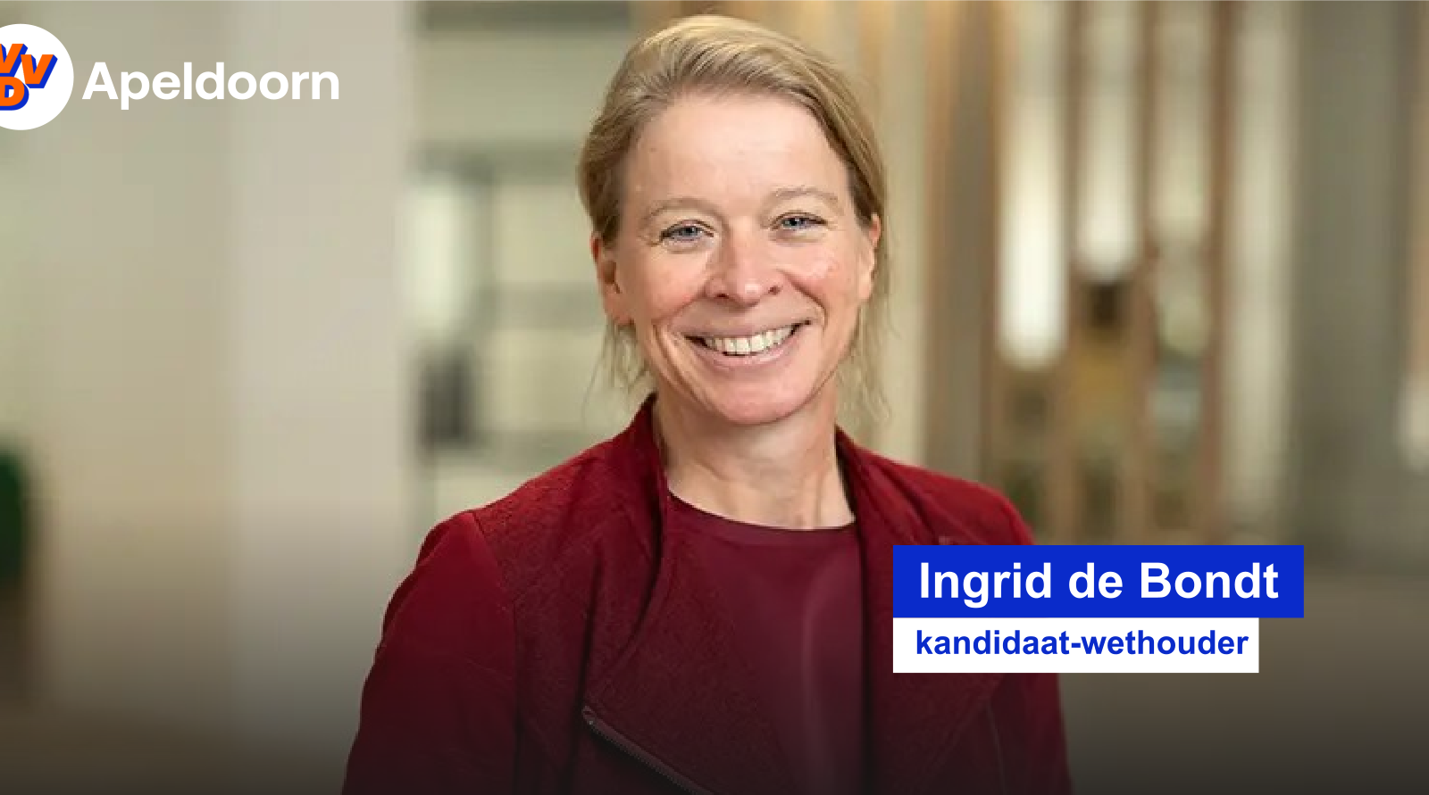 Met het oog op deelname aan de te vormen coalitie hebben we gezocht naar een geschikte wethouder: iemand uit Apeldoorn, met politieke en bestuurlijke ervaring, verbindend en daadkrachtig. We zijn verheugd u te kunnen informeren dat Ingrid de Bondt onze wethouderskandidaat is voor het nieuwe college van B&W van Apeldoorn.