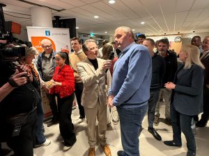 Lijsttrekker Marc Mascini wordt geïnterviewd door Eemland1 na de overwinning.