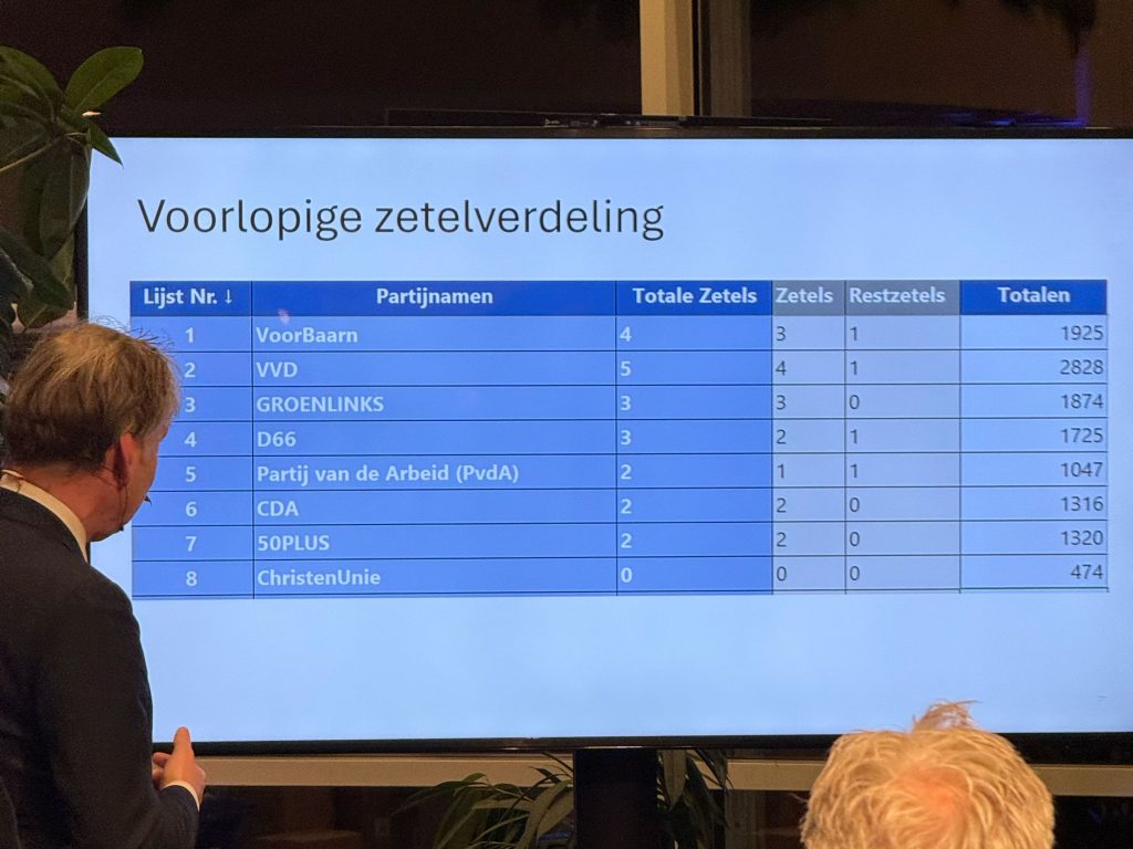 Op basis van de voorlopige uitslag van de telling op lijstniveau, komen 1. Marc Mascini (993 stemmen), 2. Noor Sluijs-van Haastert (677 stemmen), 3. Alwin Kroon (228 stemmen), 4. Lisette de Weijer (197 stemmen) en 5. Muhammed Korkmaz (183 stemmen) voor de VVD Baarn met een zetel in de gemeenteraad, zij zijn allen gekozen op basis van voorkeursstemmen.
