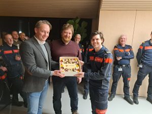 Jeroen Boer en Sander van Rij overhandigen taart aan Wesley Somers, ploegchef Brandweer Bennebroek.