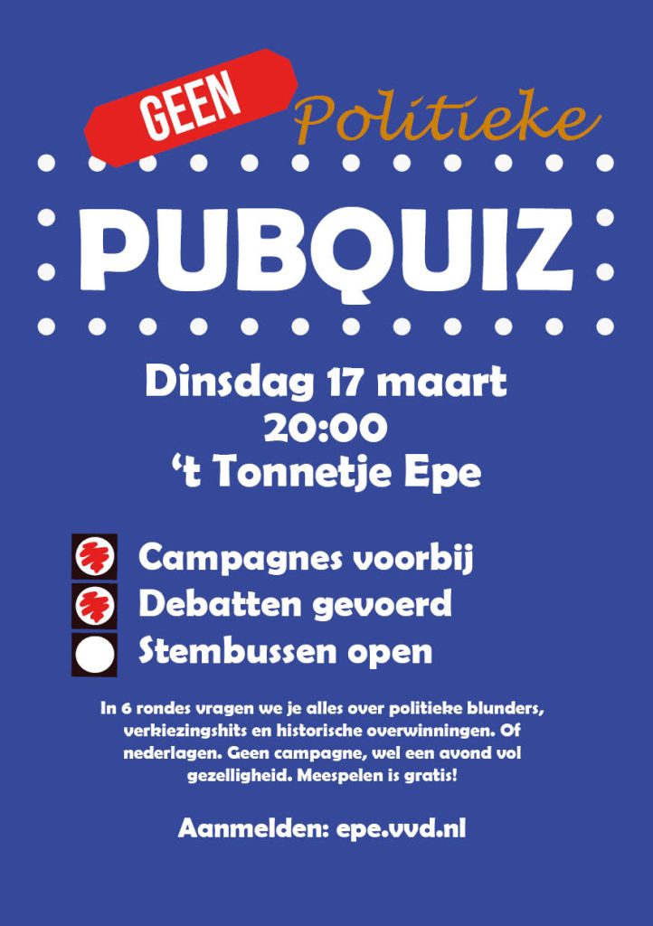 Test je kennis bij onze politieke pubquiz! Aan het einde van de campagne en aan de vooravond van de Gemeenteraadsverkiezingen, nodigen we politici, inwoners en quizzers uit om het tegen elkaar op te nemen. In 6 rondes vragen we je alles over politiek, Nederland en onze maatschappij.
