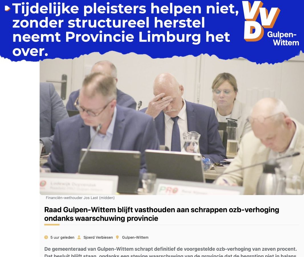 Dat de OZB-verhoging nu is tegengehouden, mag geen excuus zijn om niet door te pakken. Het risico dat de provincie al in december ingrijpt en meer zeggenschap krijgt dan ons lief is, waarbij zelfs een hogere OZB-stijging dan de huidige 7,8% mogelijk wordt, blijft groot. Dat betekent zeer beperkte lokale regie en nauwelijks vrijheid om zelf keuzes te maken voor Gulpen-Wittem.