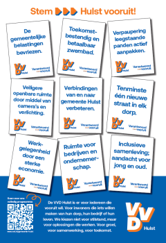 De VVD Hulst staat voor een sterke, leefbare gemeente met goede bereikbaarheid en een daadkrachtig bestuur. We geloven in vrijheid, verantwoordelijkheid en samenwerking. Inwoners moeten eenvoudig kunnen meedenken, wijken en dorpen verdienen een krachtige stem en regionale samenwerking is essentieel voor toekomstbestendig onderwijs en goede zorg in Zeeuws-Vlaanderen.