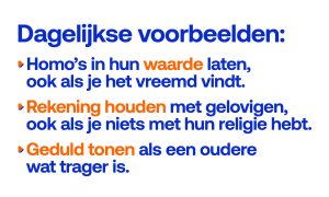 Mensen zijn niet gelijk. We zijn allemaal uniek, en dus verschillend. Mensen zijn wel gelijkwaardig. Iedereen heeft dus evenveel recht op vrijheid en kansen, wat je geestelijke overtuiging, huidskleur, nationaliteit, seksuele geaardheid, geslacht of maatschappelijke positie ook is. Discriminatie is onaanvaardbaar.