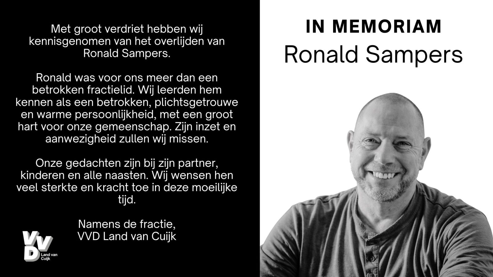 Ronald was voor ons meer dan een betrokken fractielid. Wij leerden hem kennen als een betrokken, plichtsgetrouwe en warme persoonlijkheid, met een groot hart voor onze gemeenschap. Zijn inzet en aanwezigheid zullen wij missen.