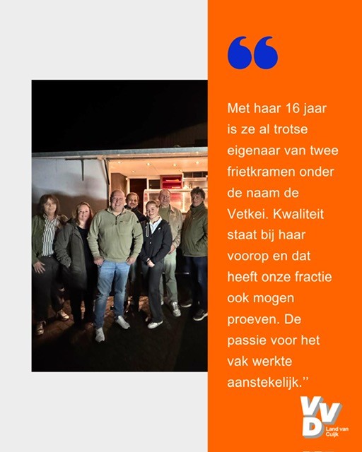 Met haar 16 jaar is ze al trotse eigenaar van twee frietkramen onder de naam de Vetkei. Kwaliteit staat bij haar voorop en dat heeft onze fractie ook mogen proeven. De passie voor het vak werkte aanstekelijk.