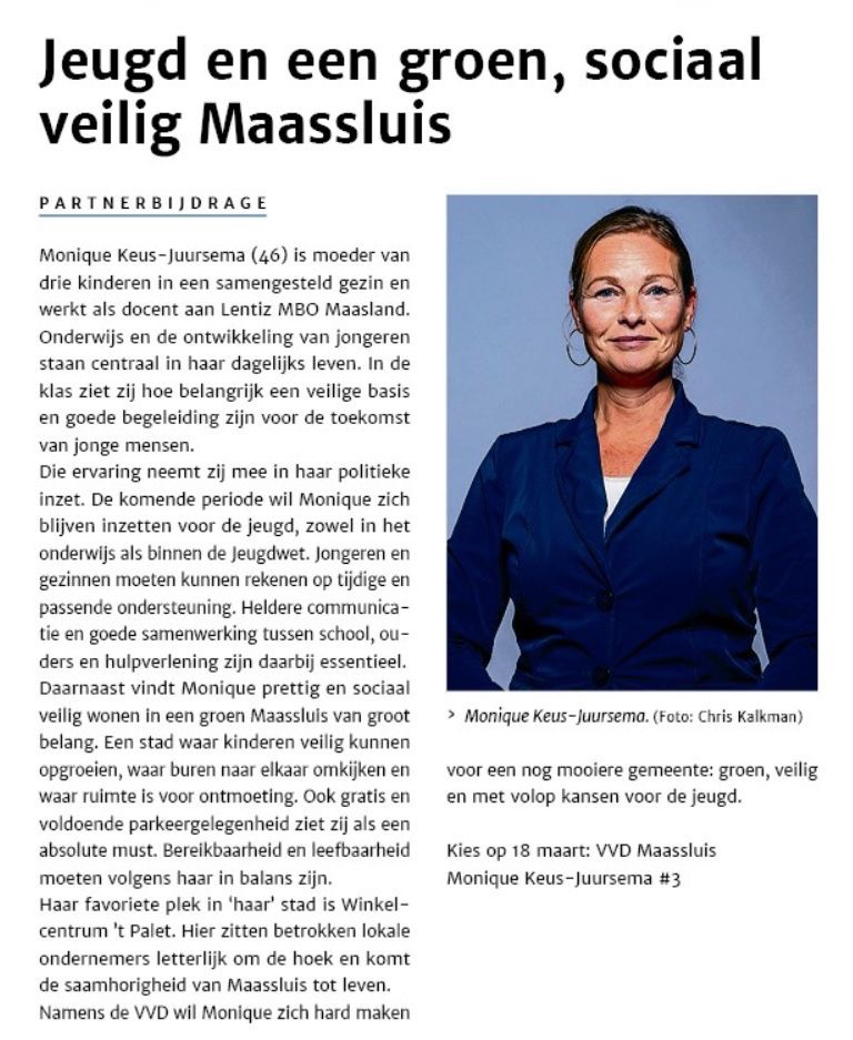 Monique Keus–Juursema zet zich in voor een groen, veilig en sociaal Maassluis waar jongeren alle kansen krijgen. Als docent en moeder van drie kinderen weet zij hoe belangrijk goed onderwijs, een veilige omgeving en sterke samenwerking tussen school, ouders en hulpverlening zijn.
