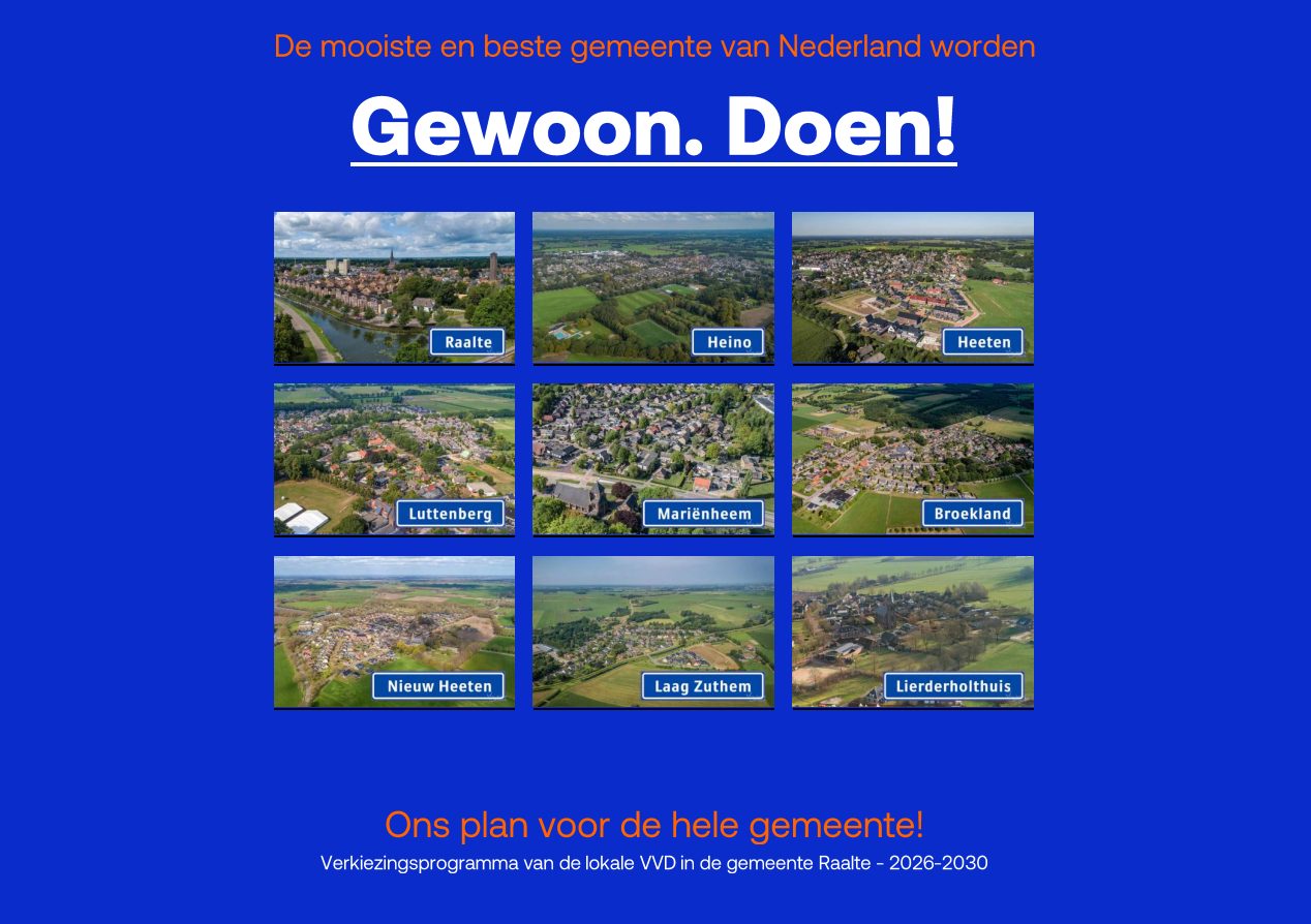 De lokale VVD staat niet alleen voor plannen, maar voor resultaten. De afgelopen jaren heeft de lokale VVD-fractie in de raad en via haar wethouder in het college zichtbaar verschil gemaakt. Er zijn flinke stappen gezet op het gebied van woningbouw in alle kernen, de gemeentefinanciën zijn op orde gebleven en belangrijke projecten zoals de spoorzone en de rondweg om Mariënheem zijn in beweging gebracht.