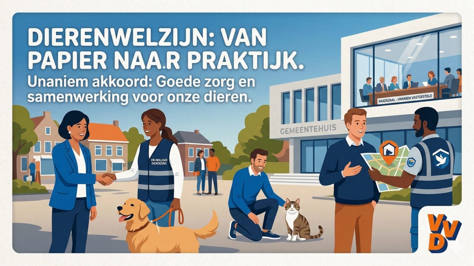 Voor de VVD is het belangrijk dat beleid niet alleen mooie woorden op papier zijn, maar ook in de praktijk werkt. Dat betekent goede samenwerking met dierenorganisaties, duidelijke kaders en vooral dat de verschillende afdelingen binnen de gemeente elkaar weten te vinden.