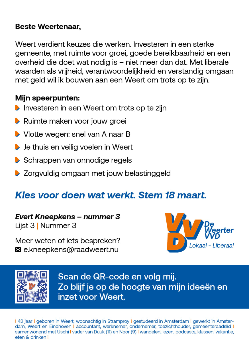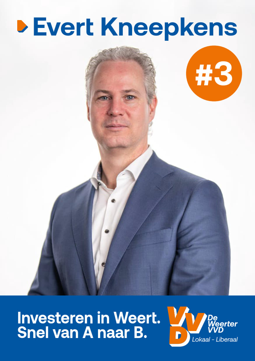 Evert Kneepkens heeft al meer dan tien jaar professionele ervaring en is werkzaam als Director Dealer. Hij is actief betrokken als raadslid in Weert namens De Weerter VVD, waar hij zich inzette voor lokale zaken zoals woningbouw en veiligheid. Daarnaast is hij een toegewijde vader en woont hij samen met zijn vrouw en kinderen in Stramproy.