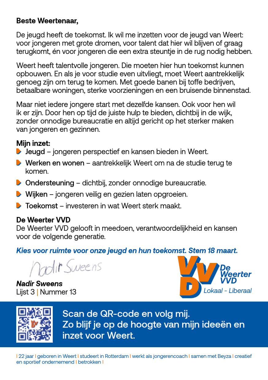 “Een van de grootste uitdagingen voor Weert is het doorbreken van stilstand. Het gaat vaak net niet slecht genoeg om in te grijpen, maar ook niet goed genoeg om echt vooruit te komen. Daardoor blijven kansen liggen, zeker voor jongeren en in onze wijken. We moeten als gemeente meer ruimte geven aan initiatief, innovatie en samenwerking, zodat Weert zich blijft ontwikkelen.”
