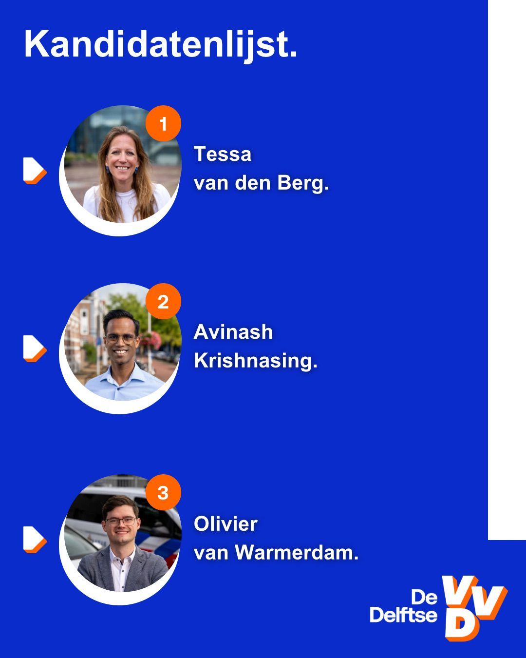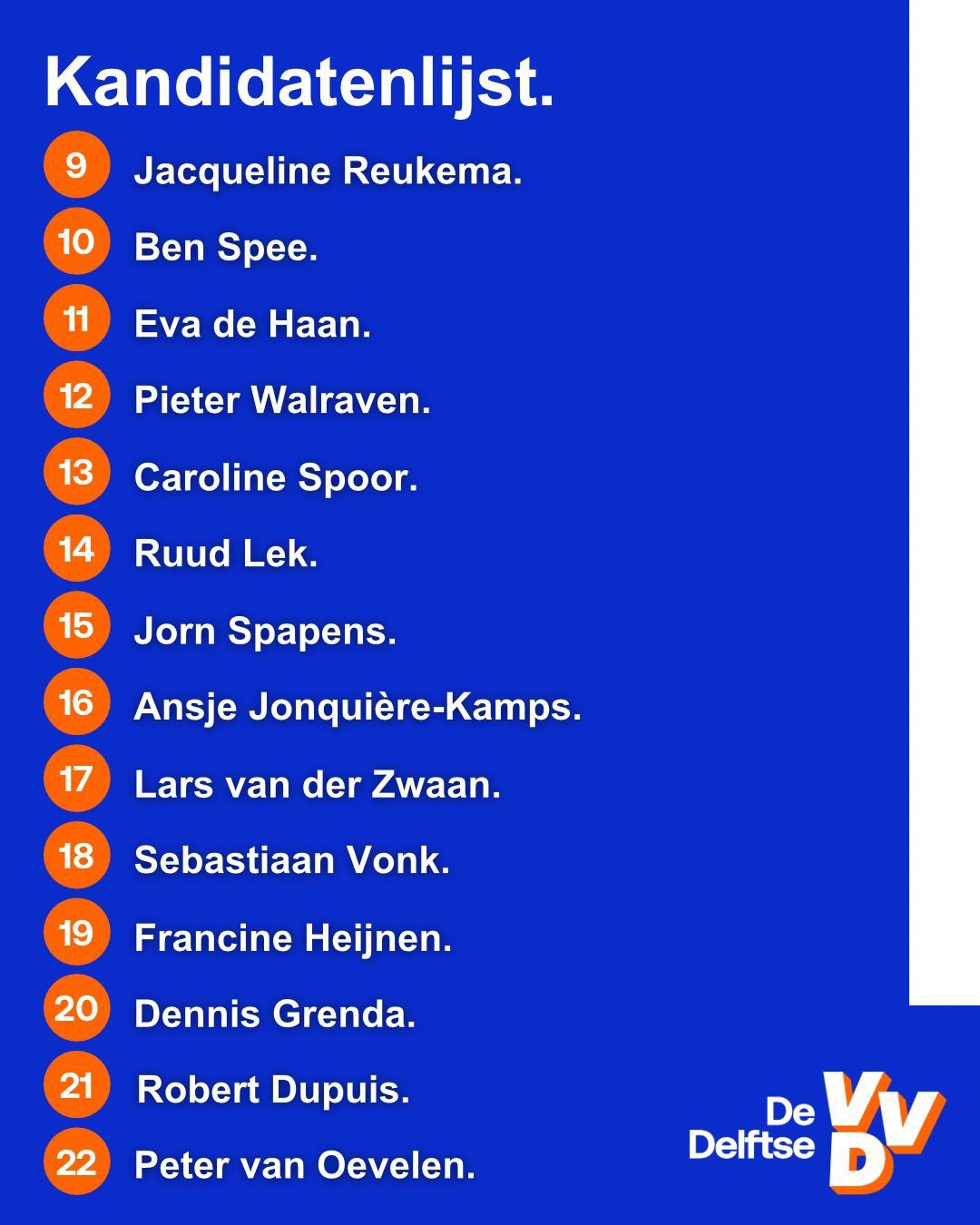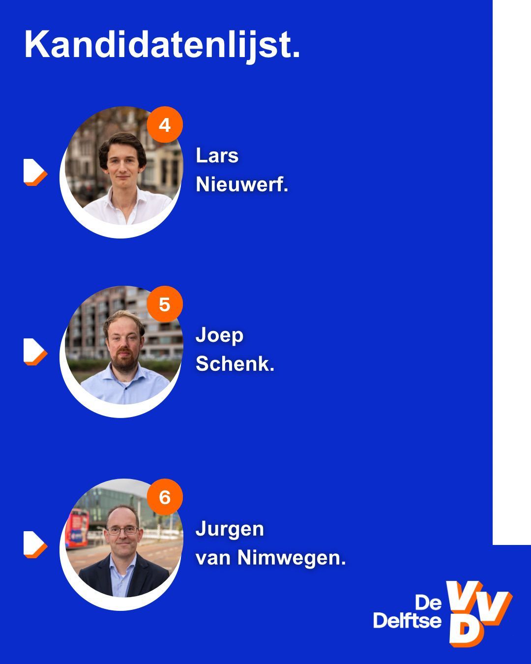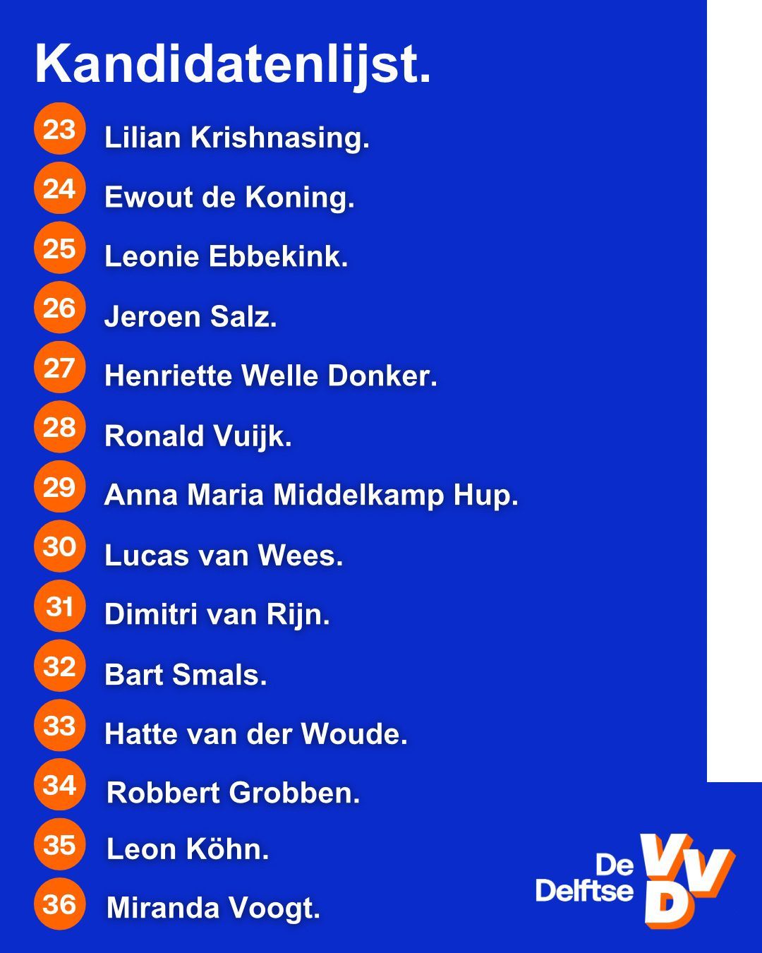 De kandidatenlijst van De Delftse VVD voor de gemeenteraadsverkiezingen 2026 is rond en wat is ie prachtig geworden. Op de lijst komen zowel enorme ervaring als nieuwe gezichten samen, en allemaal willen ze Delft nóg mooier maken!