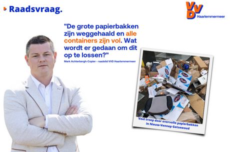 Naar aanleiding van onze vraag, weten we nu dat binnenkort extra grote containers voor oud papier worden geplaatst in plaats van de kleinere die er nu staan. Raadslid Mark Achterbergh-Copier laat tevreden weten:“Hierdoor kan er vier keer zoveel oud papier worden opgehaald en loopt de overlast van rondslingerend papier hopelijk weer terug”