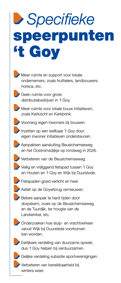 We kiezen voor daadkracht, duidelijkheid en een gemeente die werkt voor haar inwoners. Geen gezeik of gedoe, maar gemeentebestuur die stil maar daadkrachtig de problemen oplost. Wij kiezen voor stabiel bestuur, zonder partijen en wethouders die vanwege intern gedoe of niet integer gedrag de gemeente veel tijd en geld kost. We zijn er voor onze inwoners.