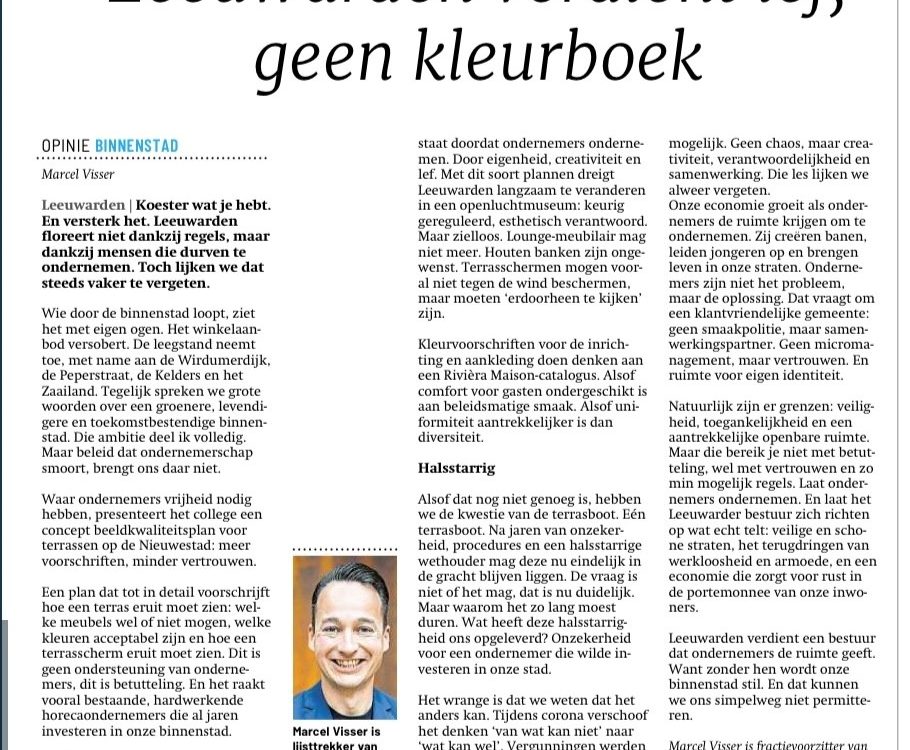 We bouwen aan een sterke, toekomstgerichte gemeente. Een Leeuwarden waar je veilig thuis bent, waar ondernemers de ruimte krijgen en waar minder regels, minder overheid en minder belastingen zorgen voor vrijheid, verandering en vooruitgang.