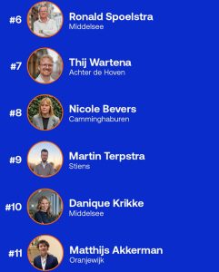 Een van de vertrouwde krachten op de lijst is Geu Luik, inmiddels vier jaar een betrokken en zichtbaar raadslid, binnen én buiten het stadhuis. Daarnaast zet de VVD stevig in op verjonging. Zo staat jong talent zoals Lennart Kolk (nr. 3) hoog op de lijst en maakt de vijftienjarige Matthijs Akkerman zijn opwachting als een van de jongste kandidaten van Nederland. Volgens de VVD brengt dit “een frisse blik waar de lokale politiek alleen maar beter van wordt.”