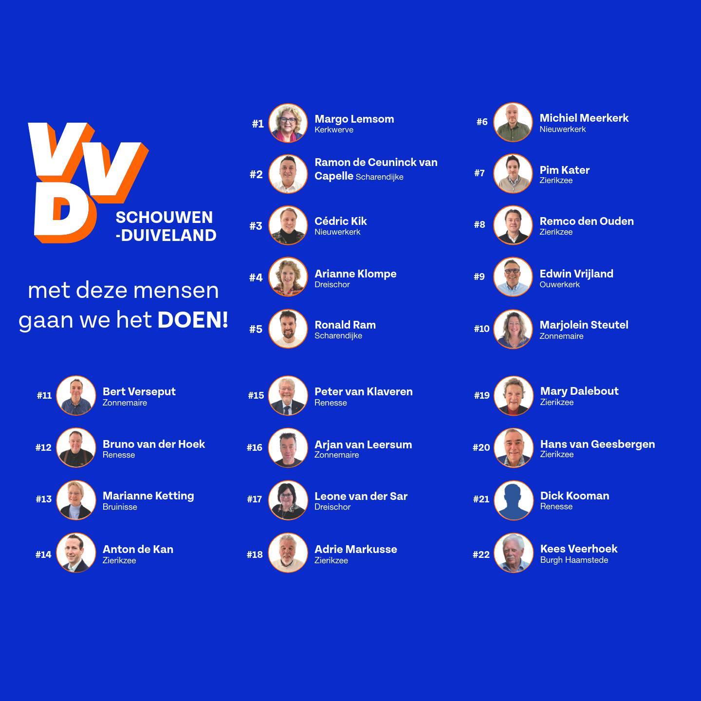 Ons eiland is niet gemaakt door praten, maar door dóén. Door mensen die hun schouders eronder zetten en niet weglopen als het lastig wordt. Die mentaliteit zit in ons. We kennen het eiland. We weten wat er speelt. We denken vooruit en pakken door. Geen omwegen, geen smoesjes. Schouwen-Duiveland moet een plek blijven waar je kunt wonen, werken, ondernemen en leven zonder gedoe. Wij nemen verantwoordelijkheid. Gewoon doen!