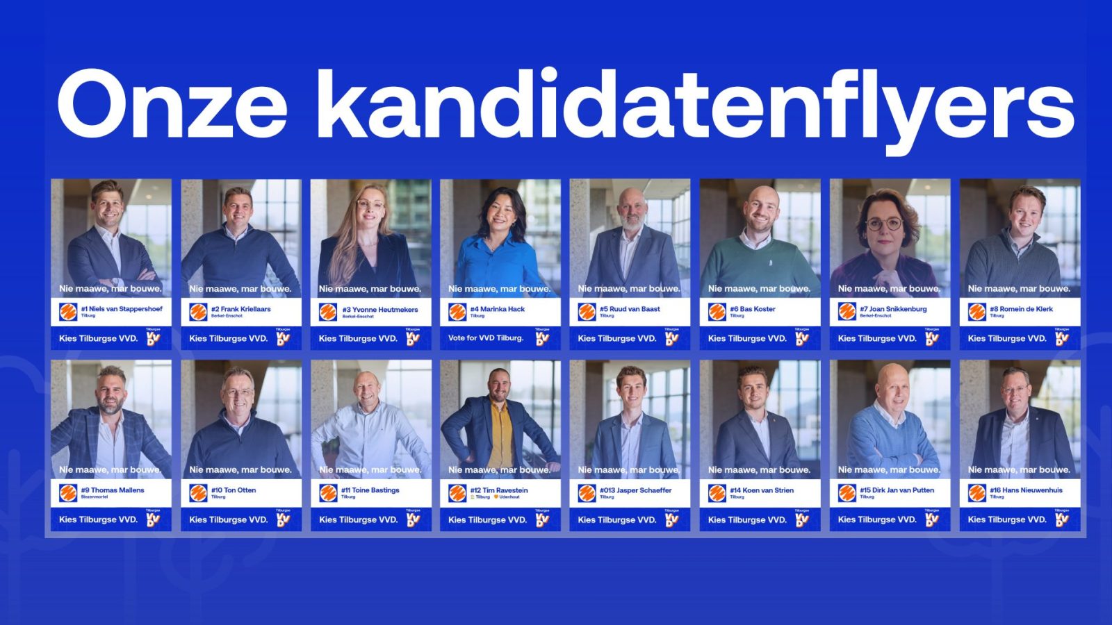 Op iedere flyer staat het persoonlijke verhaal van één van onze kandidaten. Waarom stellen zij zich kandidaat? Wat drijft hen? En hoe willen zij zich inzetten voor de inwoners van de gemeente Tilburg? In hun eigen woorden vertellen zij waar zij voor staan en wat zij willen betekenen voor onze stad en dorpen.