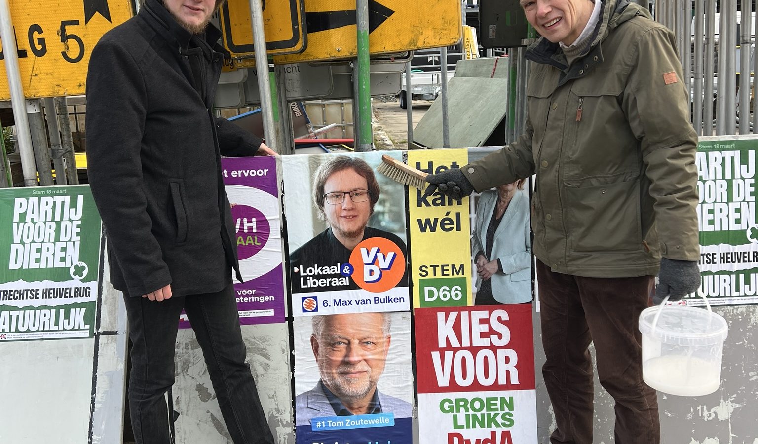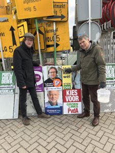 Onze top-plakkers Roel Derks en Jan Koek hebben het weer voor elkaar gekregen: de nieuwe posters voor de gemeenteraadsverkiezingen van aanstaande 18 maart hangen aan de gemeenteborden. Ook Max van Bulken was mee om een handje toe te steken. Ze moesten er op hun vrije zaterdag vroeg voor op, waarbij een hoop kou te trotseren was. Toch is het gelukt! Vanaf aankomende week hangt de VVD zichtbaar in de buitenruimte. Zie jij onze toppers al hangen?